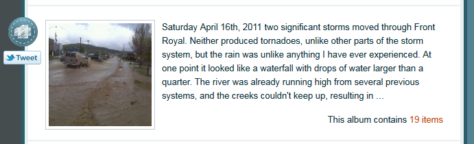 Yep, that’s all there is to that magic function. Anytime you work with $post in a function you need to make it global (line 7). Line 9 fetches the attachments for the post and line 10 counts how many. Line 12 retrieves the content limit. For standard posts I’m limiting to 500 characters, but my extra paragraph means I need a limit of 400. I’ve also made the link ” ” because I want the ellipse added to the end, but no actual link text. Line 14 creates the last paragraph of text detailing how many images are in the gallery and linking to the post. I added a class to the